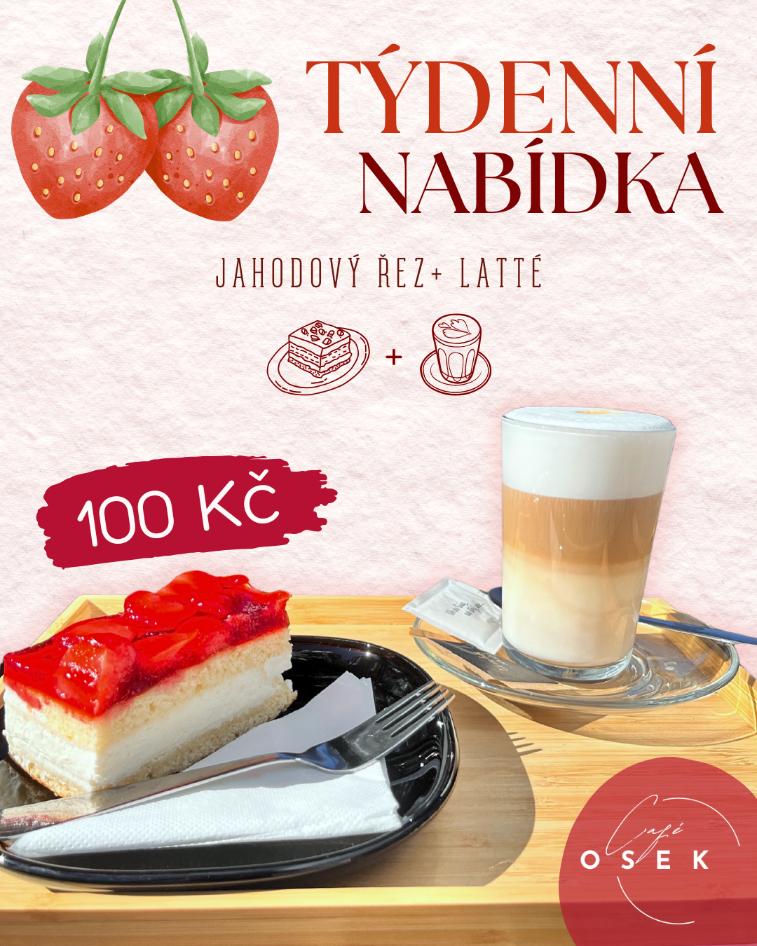 Jahodový řez + latté za 100,-